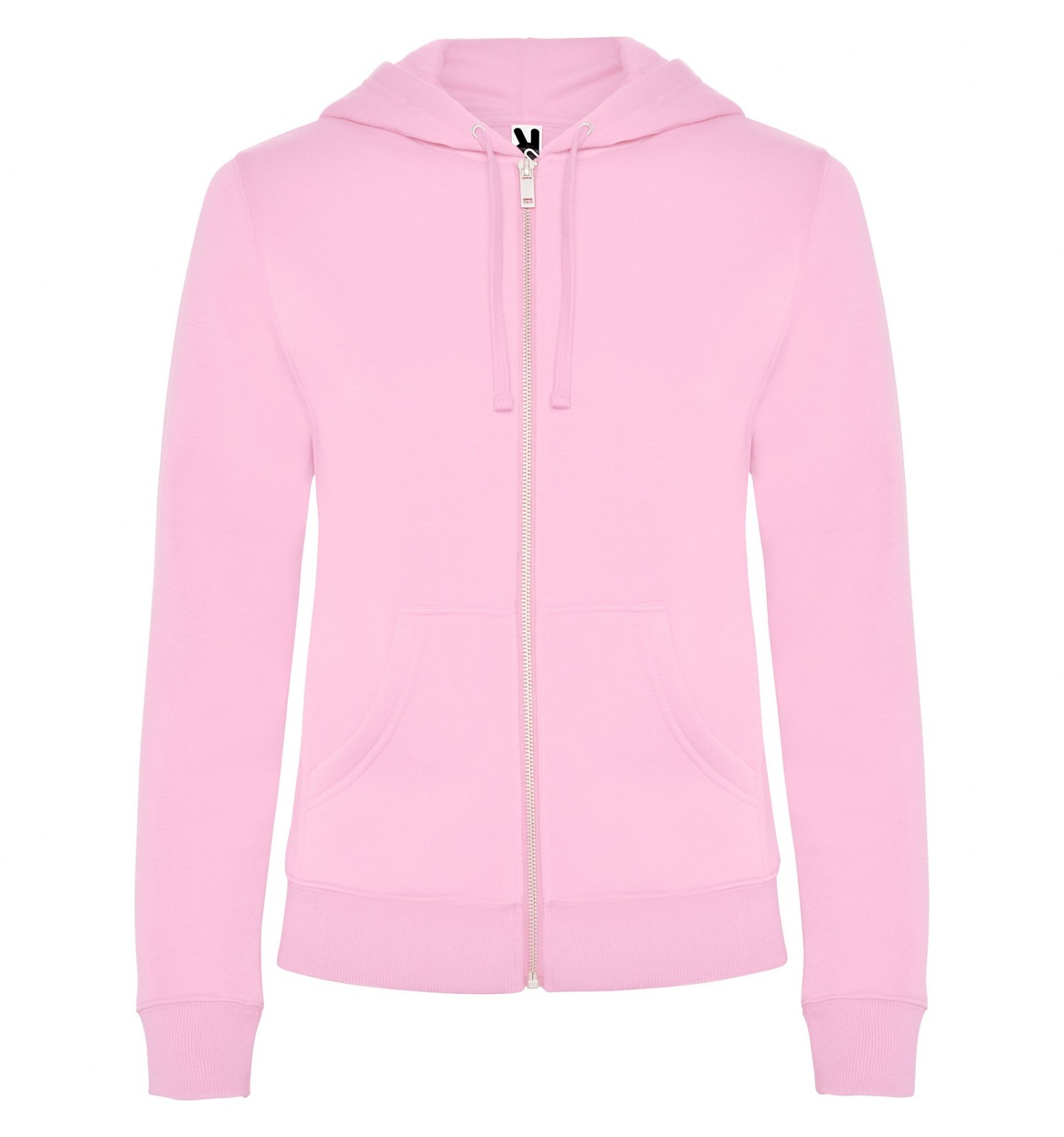 Hanorac de damă cu glugă căptușită. Fermoar metalic în față și buzunar tip marsupiu. Bandă întărită pentru acoperirea cusăturilor la gât. Talie și manșete în punct canalé 2x2. Model cambrat.