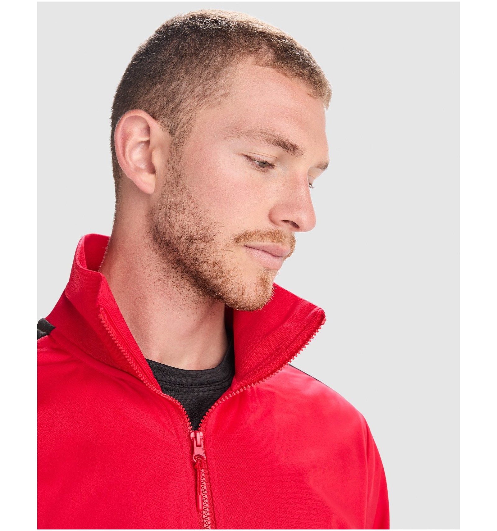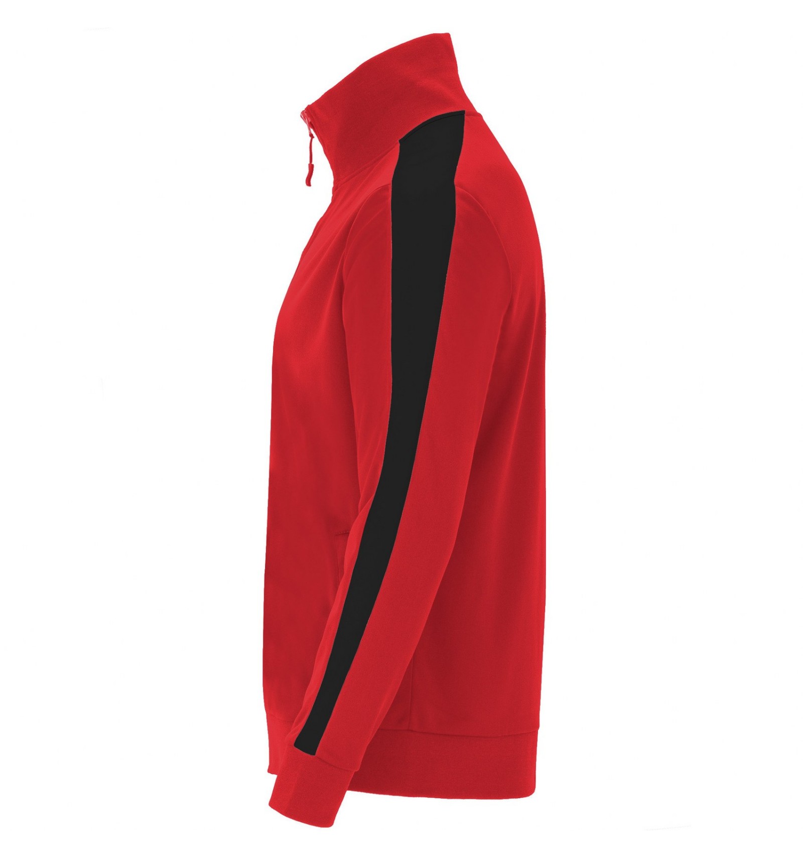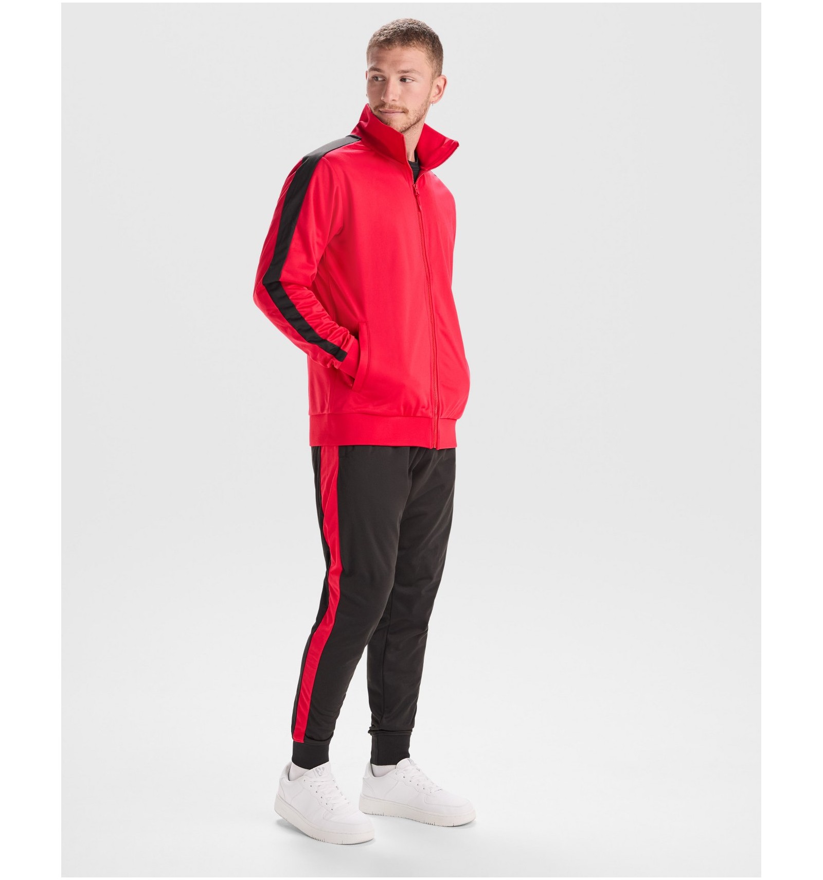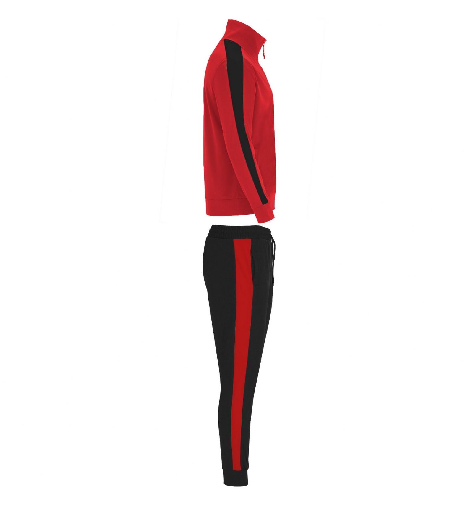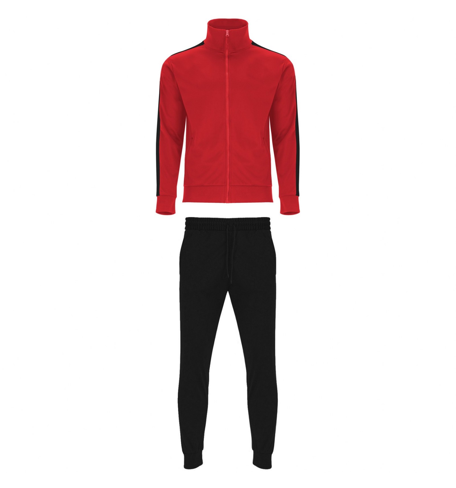 Trening format din două piese, bluză și pantaloni. 1. Guler înalt cu bandă de acoperire a cusăturilor la interior, de aceeași culoare cu gulerul. 2. Guler, manșete și talie în canalé 1x1. 3. Fermoar pe mijloc cu cheiță. 4. Bluză cu buzunare laterale cu fermoar. 5. Bandă laerală în contrast de culoare. 6. Pantaloni cu betelie elastică în talie și șnur reglabil. 7. Două buzunare laterale. 8. Buzunar la spate cu fermoar. 9. Pantaloni cu manșetă elastică în canalé 1x1.